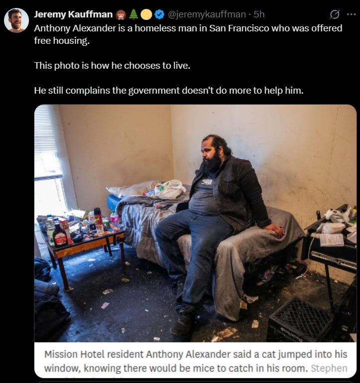 I did also want to commend Chris Arnade’s recent excellent piece to you, “America and Public Disorder”. Chris (who has traveled the world) points out in that piece that these problems (think people living on the street) are especially bad in the United States, and he sort of blames our love of freedom for that. If your brain is badly broken in some way, or if you aren’t very intelligent, living in a culture that has extremely strong social norms creates walls that help force you into a reasonable existence. America does not have those walls because we instead say things like “go find yourself, you can be whatever you want to be”, and so for us those people instead end up doing all manner of destructive things to themselves and to the public at large. We sort of “owe them” something like treatment in an institution as payment for being freedom people, Chris says.