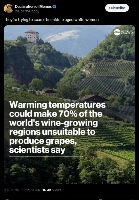 Let’s give the headline writer the benefit of the doubt there and say they’re correct. But if warmer temperatures would make certain regions of the globe that are presently used for growing grapes unsuitable, wouldn’t they made other regions of the globe that are presently NOT suitable for growing grapes, newly available? Almost certainly. There is a positive other-side to all of these stories that is just ignored from a desire to stoke panic.