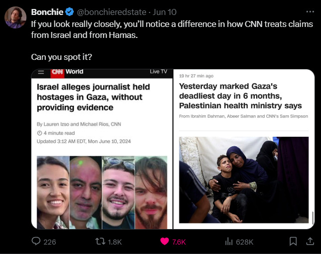 Let’s assume that both of these headlines are basically true, but even if so, there is a definite difference in reporting posture by CNN. Skeptical language is added to the first, implying to the reader Israel’s claim probably isn’t true, whereas the second is reported uncritically. For the second, though this might be too kind, I have sometimes used the phrase “bias-induced laziness”. Tell the journalist something they want to hear, and they will have no further questions, they will do no further investigation, they will happily just repeat whatever you said.
